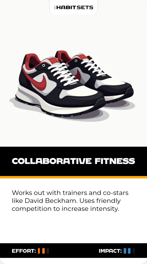 Works out with trainers and co-stars like David Beckham. Uses friendly competition to increase intensity.