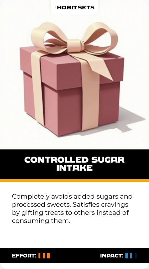 Completely avoids added sugars and processed sweets. Satisfies cravings by gifting treats to others instead of consuming them.