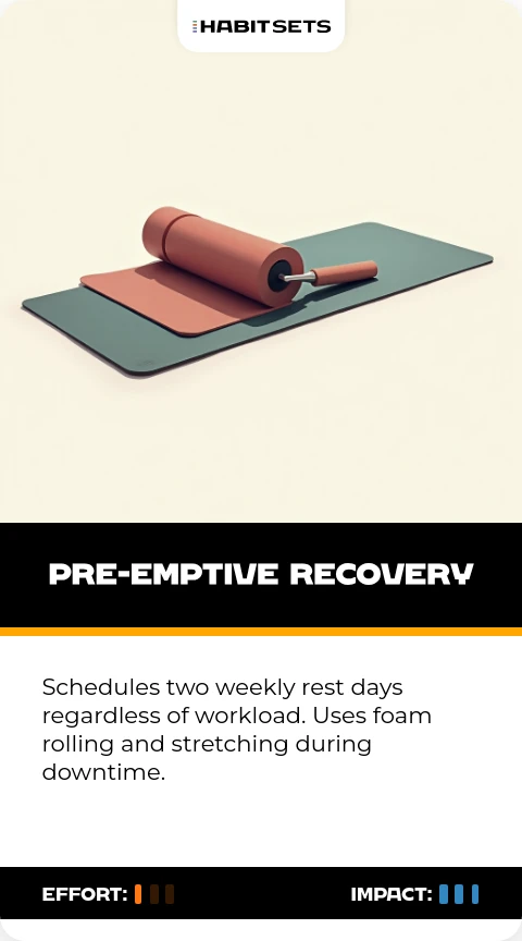 Schedules two weekly rest days regardless of workload. Uses foam rolling and stretching during downtime.