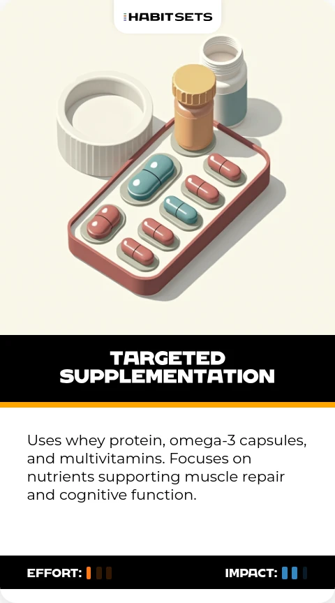 Uses whey protein, omega-3 capsules, and multivitamins. Focuses on nutrients supporting muscle repair and cognitive function.