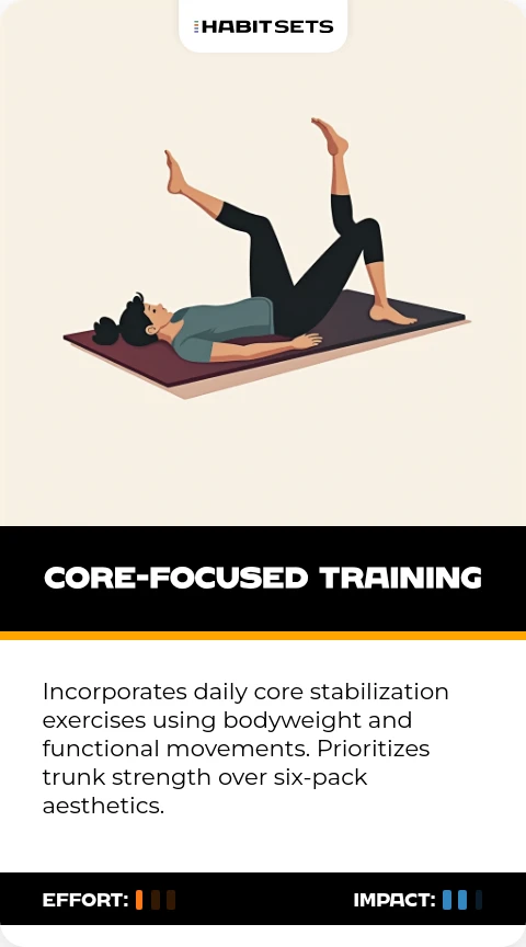 Incorporates daily core stabilization exercises using bodyweight and functional movements. Prioritizes trunk strength over six-pack aesthetics.
