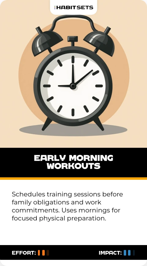 Schedules training sessions before family obligations and work commitments. Uses mornings for focused physical preparation.