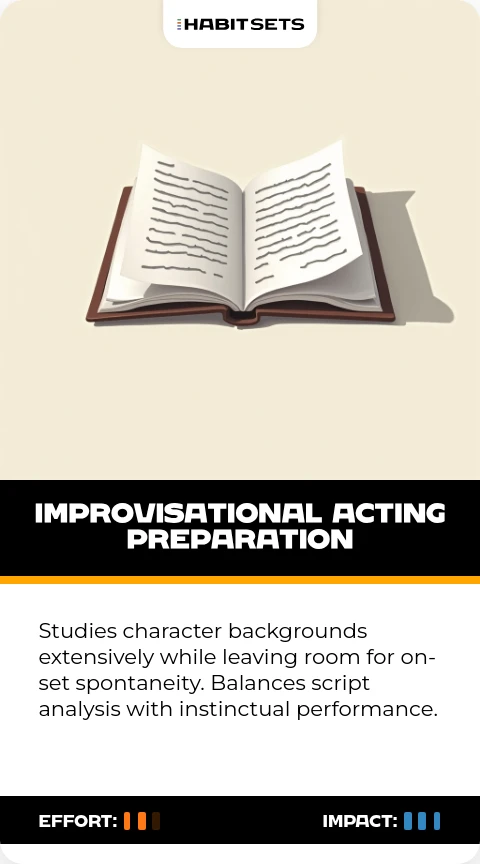 Studies character backgrounds extensively while leaving room for on-set spontaneity. Balances script analysis with instinctual performance.