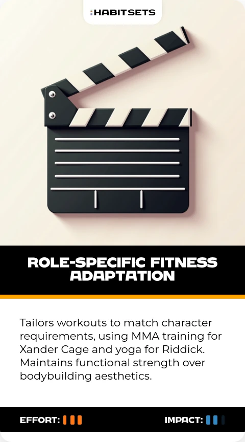 Tailors workouts to match character requirements, using MMA training for Xander Cage and yoga for Riddick. Maintains functional strength over bodybuilding aesthetics.