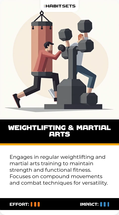 Engages in regular weightlifting and martial arts training to maintain strength and functional fitness. Focuses on compound movements and combat techniques for versatility.