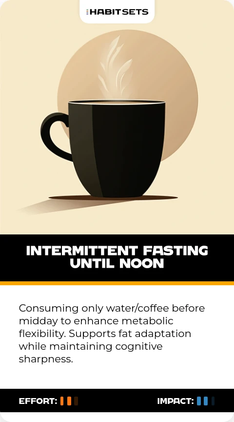 Consuming only water/coffee before midday to enhance metabolic flexibility. Supports fat adaptation while maintaining cognitive sharpness.