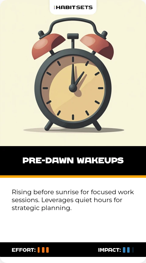 Rising before sunrise for focused work sessions. Leverages quiet hours for strategic planning.
