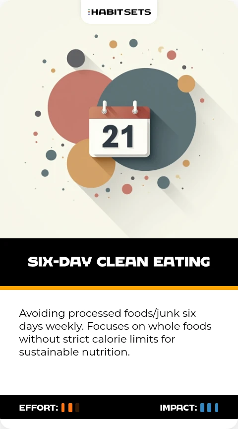 Avoiding processed foods/junk six days weekly. Focuses on whole foods without strict calorie limits for sustainable nutrition.