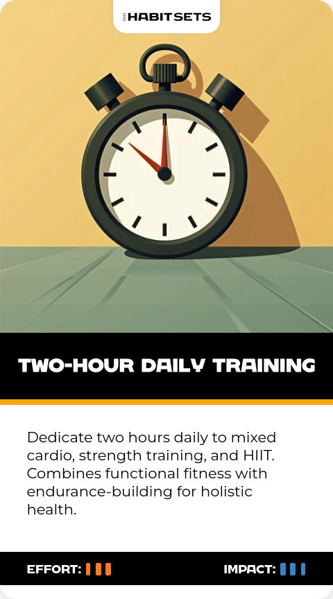Dedicate two hours daily to mixed cardio, strength training, and HIIT. Combines functional fitness with endurance-building for holistic health.